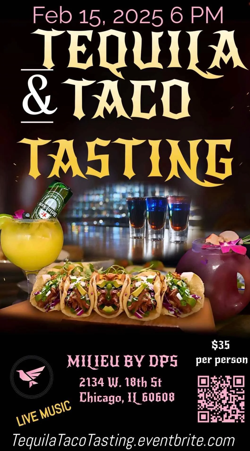Únase a nosotros para una noche divertida probando un delicioso tequila y sabrosos tacos en nuestro evento. Prepárate para disfrutar de una variedad de sabores de tequila y saborear unos deliciosos tacos.