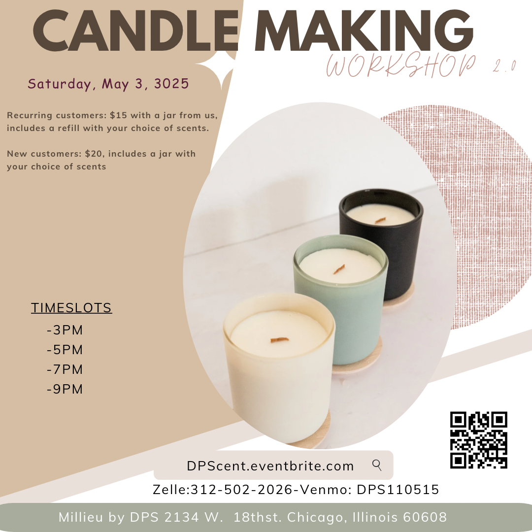 Join us for a hands-on experience where you'll learn the art of candle making! Our talented instructors will guide you through the process of creating your very own custom candles. This workshop is perfect for beginners and seasoned crafters alike. All materials will be provided, just bring your creativity! Don't miss out on this fun and creative event. See you there!